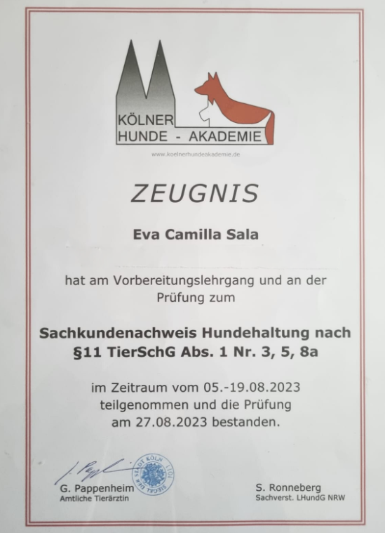 Die Erlaubnis nach § 11 des Tierschutzgesetzes – oft „Sachkundeprüfung“ genannt – ist für uns Züchter weit mehr als ein Stück Papier. Sie ist ein Versprechen: Hinter jeder noch so kleinen Entscheidung steht Fachwissen, und unsere Zucht dient dem Wohl der Hunde. Mit diesem staatlich anerkannten Zeugnis wird bestätigt, dass wir die nötigen Fachkenntnisse besitzen und dass unsere Haltungs- und Zuchtbedingungen transparent, fundiert, nachvollziehbar und mit hoher Verantwortung geführt werden.