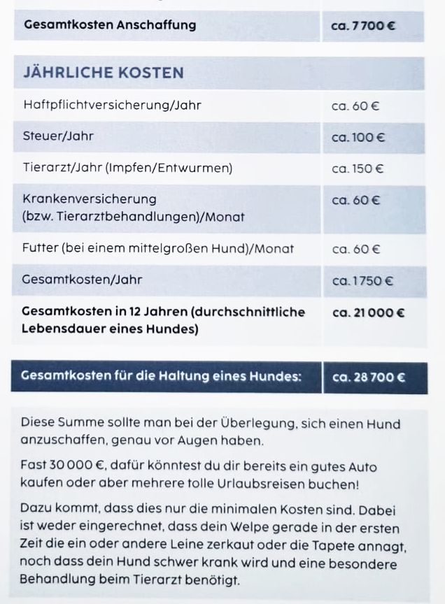 Summe pro Jahr: 29.460 € – allein mit einer Hundepension bei gleicher „Hundezahl“ wie mit 2 Elterntieren + 4 Welpen.