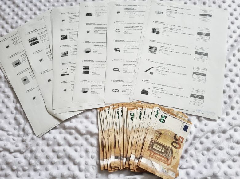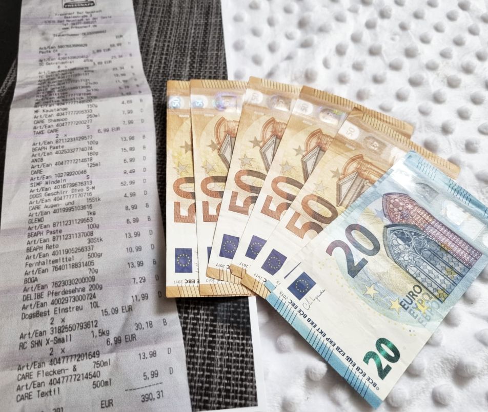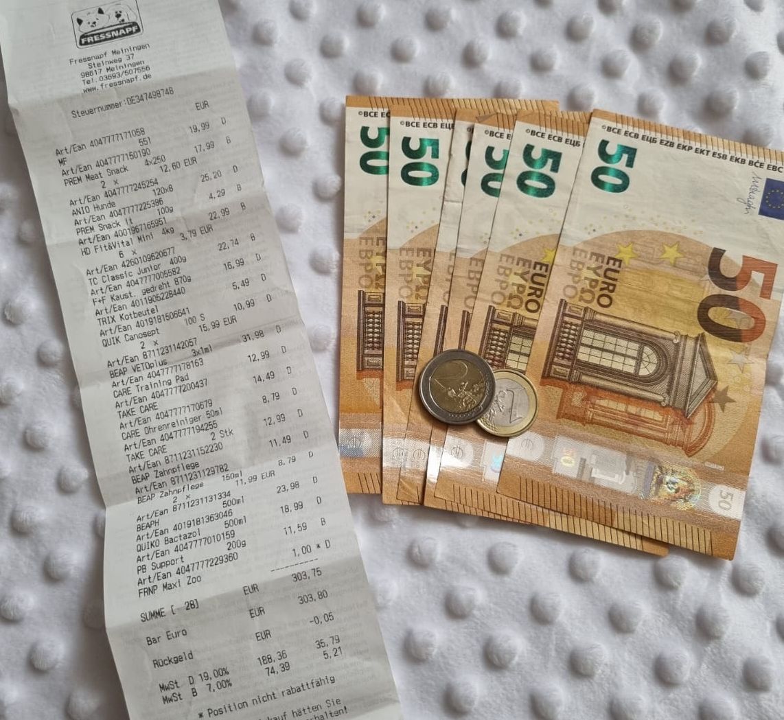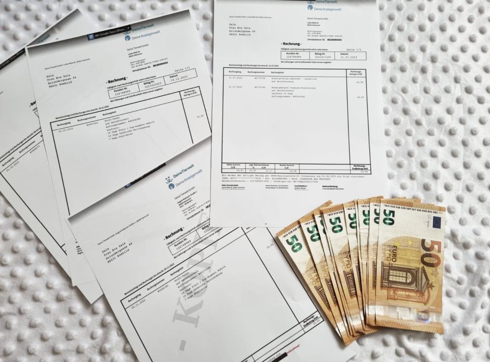 Kommen wir zu den „kleineren“ Rechnungen, die ich als kleine „eBay-Käufe“ bezeichne – gefühlt sind es 1.000 Stück, die aber fast alle zwischen 2 und 100 Euro liegen. Mein Inventar reicht von Chiplesegeräten über hochwertige XXL-Handtücher und schicke Hundeklamotten bis hin zur lebensnotwendigen Wärmelampe. Nicht zu vergessen: die Welpenmappen für Käuferunterlagen, ein HP-Drucker sowie unzählige Druckerpatronen, Kochgefäße und jede Menge kleines und großes Spielzeug. Für ein aufgeräumtes Haus sorgt eine schlichte Kommode für Hundezubehör. Zudem: Scheren, Fütterungsspritzen, Tassen/Gläser für Besucher, Küchenfeinwaage, Wurfkiste, Babyhalsband/Babyleine, die wir den Pudel-Adoptiveltern mitgeben. Außerdem Pudel-Pflegeprodukte, die der Fressnapf um die Ecke nicht führt und die ich benötige. Kartenleser für die Kamera (Spiegelreflex), jede Menge Ladekabel fürs Handy – die unsere Pudelwelpen gern zerkauen –, wiederaufladbare LED-Lichter für Mützen, ein gebogenes Scherenset zum Frisieren, eine Überwachungskamera, Hintergründe für die Homefotografie, Paracord (lange Schnur zur Erziehung), auskochbare Inkontinenzunterlagen, ein Pudelwelpen-Auslauf, eine beheizte Hundehütte für draußen, ein Sofaplüschbezug; gegen die Mücken: das Raid Night & Day Trio Set. Auch ein Vileda-Wischer für den Boden inkl. Eimer darf nicht fehlen, ebenso rutschfeste Stufenmatten für unsere Natursteintreppe.