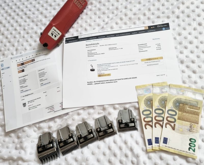 Für die Pflege unserer Pudel-Elterntiere benötigen wir eine professionelle Schermaschine mit mehreren Scherköpfen/Aufsätzen. Diese Schneidsätze müssen regelmäßig nachgeschliffen werden – kostenmäßig nahezu auf Neukauf-Niveau. Zum Vergleich: Ein externer Hundefriseur läge bei uns bei ca. 80 € pro Hund und Termin.