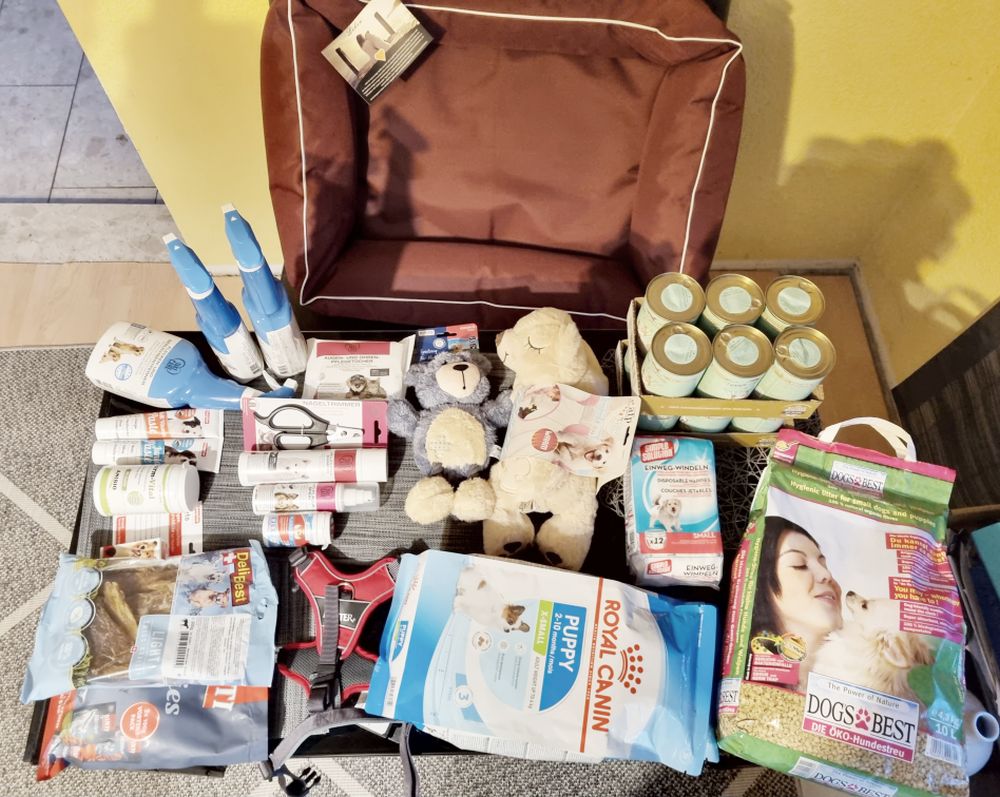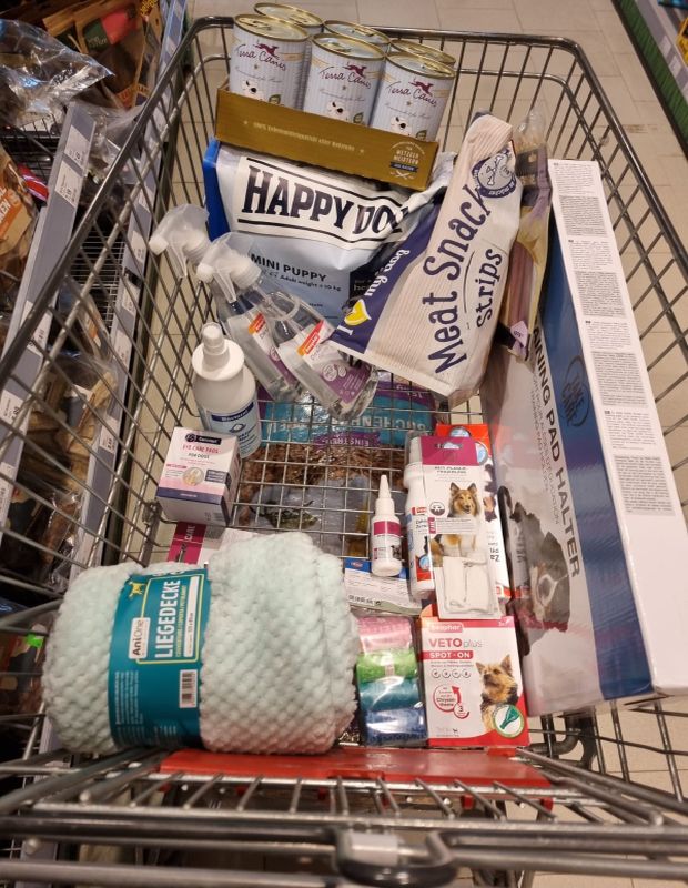 Wie Sie sehen können - wenn ich gerade keine „Welpentoilette“ brauche, benötige ich eben Tragebox(Sehe Bild), Hundeliegeplätze, Tragetasche, XXL-Baumwollhandtücher (die während der dreimonatigen Welpenaufzucht etwa 280-mal ausgekocht werden und danach unbrauchbar sind), weitere Babysachen, Plüschspielzeug, Bälle, Tunnel, Napfunterlagen, rutschfeste Läufer/Teppichfliesen, Welpengitter/Absperrgitter, Welpenhalsbänder in XS, eine leichte Schleppleine, Clicker bzw. Trainingspfeife, ein Erste-Hilfe-Set für Hunde und sonstige Wurfutensilien – die Liste ist endlos lang. Dazu kommen, wie Sie sehen können, die wöchentlichen „Pflichtartikel“ wie Desinfektionsmittel (welpengeeignet), Mittel zur Zähnchen-, Augen-, Ohren- und Fellpflege, Futter und Kauartikel usw..