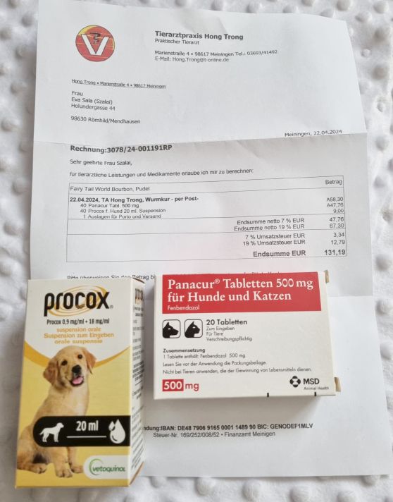 Pro Wurf geben wir für Prophylaxe-Medikamente und begleitende Behandlungen rund 500 € aus. Diese Position ist notwendig und darf nicht „knapp kalkuliert“ werden – jede Abkürzung rächt sich auf Kosten der Pudelwelpen-Gesundheit.